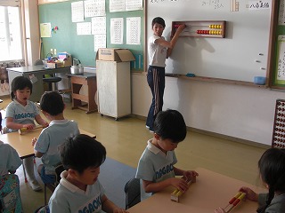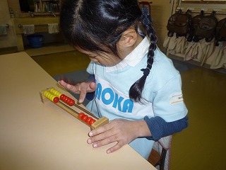 昨日、年長組で20玉そろばんをしました。「1,2,3・・・」と数えながら、玉を動かす表情は真剣です!!慣れてくると少しずつスピードアップして、玉を動かしていましたよ☆