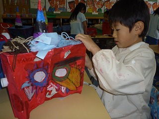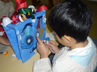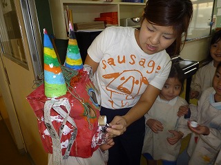 年長組では、鬼のお面作りをしました!ストローや毛糸・キャップなどなど・・・自分達で工夫しながら貼り付けていきました♪自分達で作ったオリジナルの鬼のお面なので、2月3の豆まきが楽しみです☆