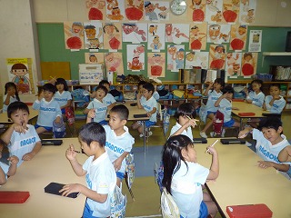 「鉛筆を軽くにぎって・・・」みんな一生懸命です。持ちやすいように赤い印をつけて、子どもたちは鉛筆の持ち方が上手になってきています。後は、”もっとゆっくり、もっと丁寧に”が目標です☆