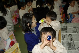 今日は、年少・最年少の参観がありました。最年少では、トイレットペーパーの芯を使ってみのむしを作りました。年少は折り紙をはさみで切って色とりどりの望遠鏡が出来上がりました♪