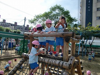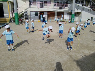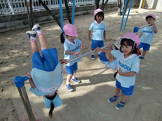 給食を食べた後は、元気よく外あそび!年少では、鉄棒や砂遊びをするお友達がたくさん。年中では、なわとびが流行っているみたいです!1人で跳ぶだけでなく、みんなの縄跳びをつなげて電車にもなっていましたよ。年長は英語の先生と一緒に楽しくボール遊びをしていました。2日ぶりの良いお天気でみんな大喜びでした♪♪