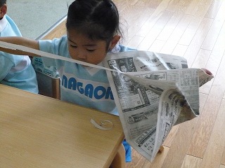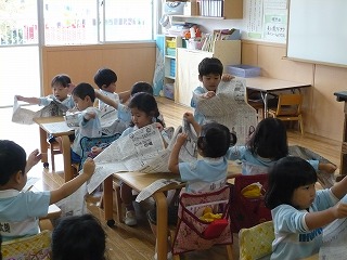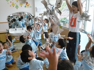 全部やぶったら、みんなで集まって新聞紙の雨の