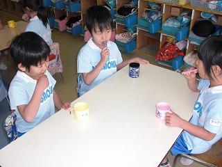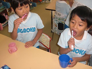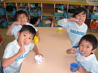 幼稚園では音楽に合わせて歯ブラシの持ち方・歯の磨き方を毎日指導しています。