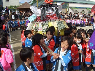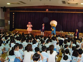 今日は子育て応援キャラバンの方が幼稚園に来てくれました。“夢つくしちゃん”と“めしまるくん”も遊びに来てみんな大喜び♪