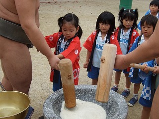 道具の話を聞いてさっそくおもちつきです。陸奥部屋のおすもすさんも