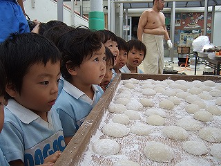 楽しみにしていたおもちつき。講堂でおもちができるまでや、もちつきに使う