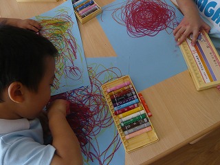 紙の上を、黄色、オレンジ、赤のクレヨンで、グルグルらくがき遊び!!