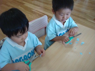 はさみを使って、色紙を切りました。「パーグーパーグー」