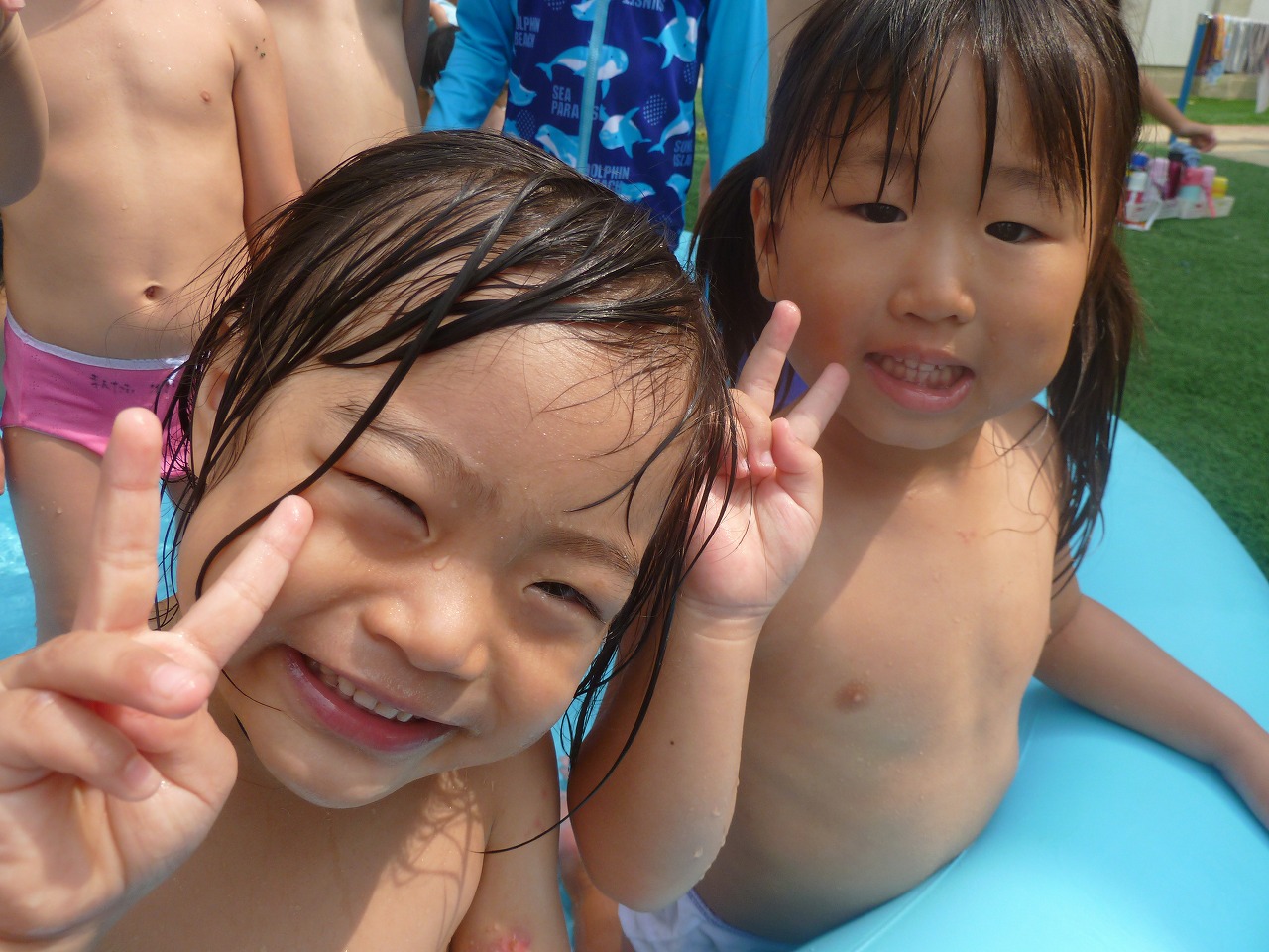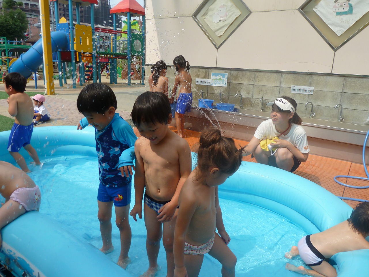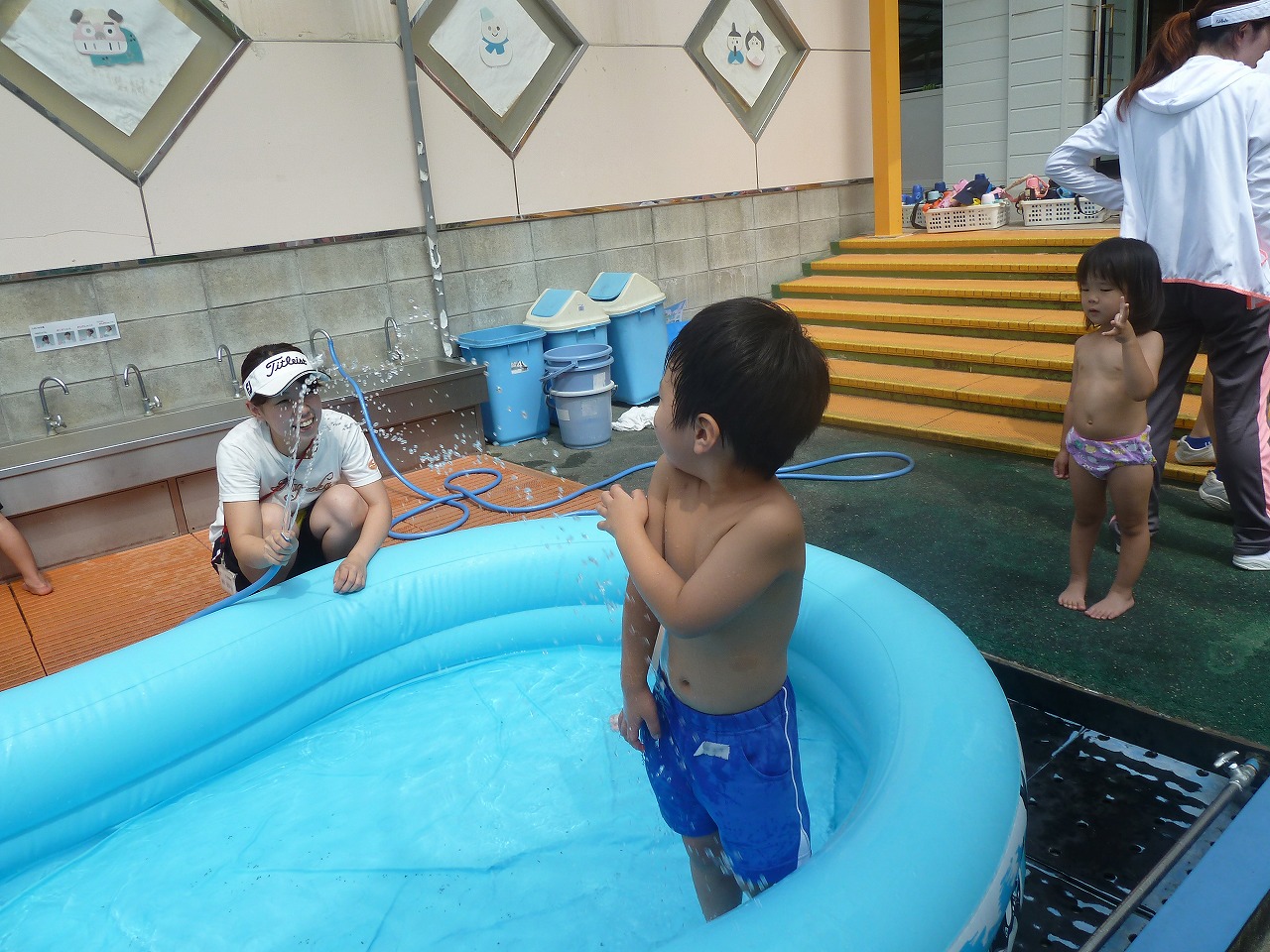 外遊びでは、水遊びなどをして暑さ対策♪