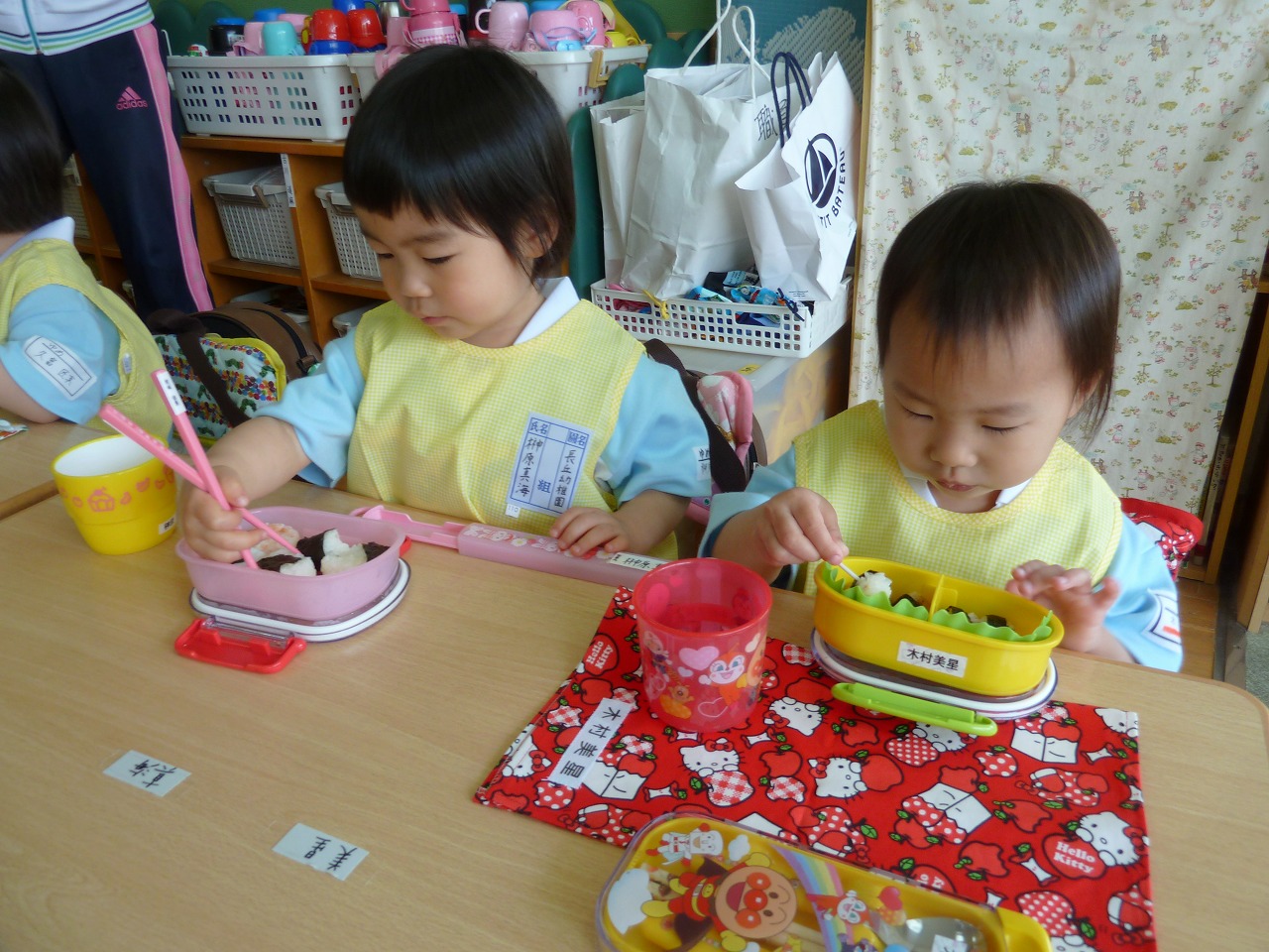 おにぎりもぐもぐ!毎日みんなお弁当の時間をとっても楽しみにしているね♪♪明後日からはいよいよ給食も始まります!ホカホカ温かくて美味しい給食楽しみだね!