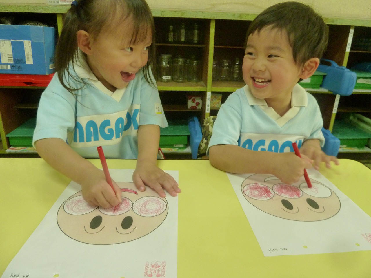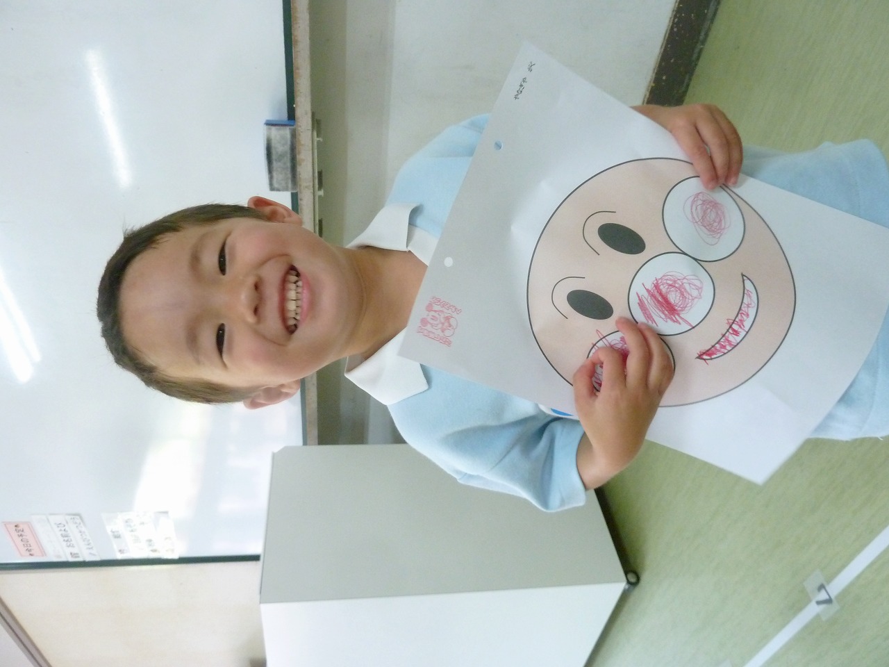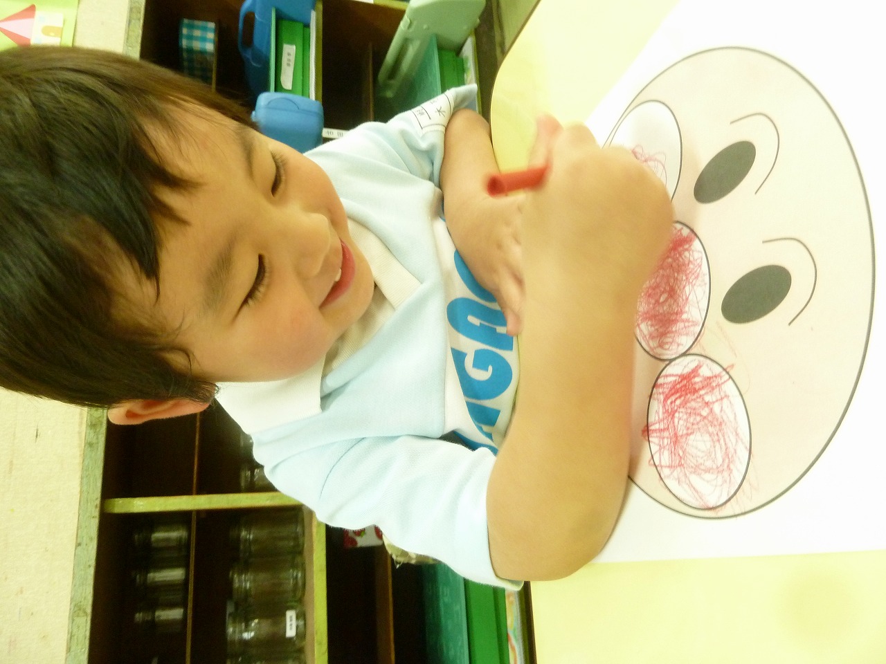 今日はみんなが大好きなアンパンマンのぬりえをしてあそびましたよ!ほっぺたとお鼻をぐるぐるぐる・・・。最後に口をぬって完成ー!!「アンパンマン、元気がでてきたね」と子供達もとっても嬉しそうでした♪