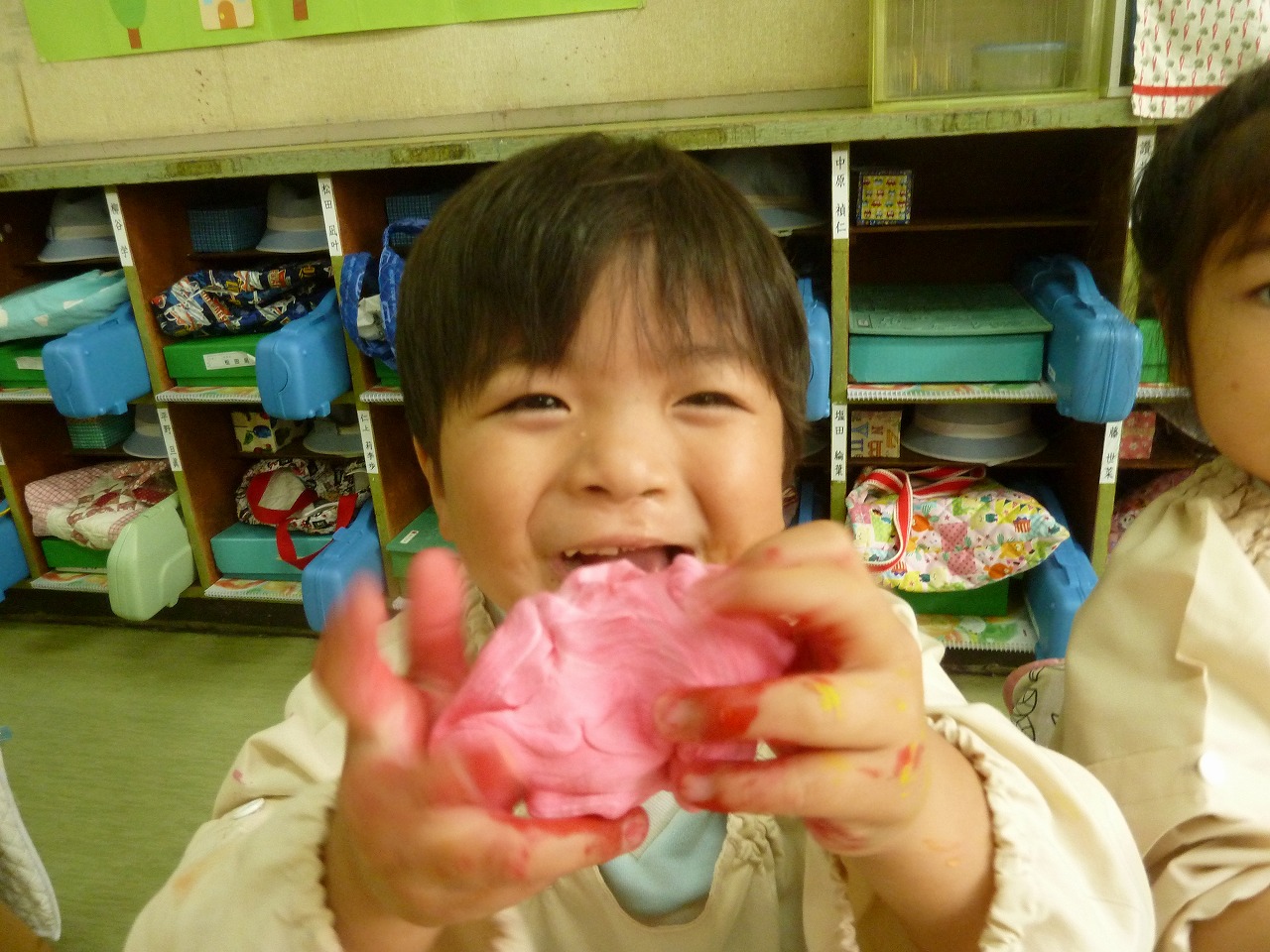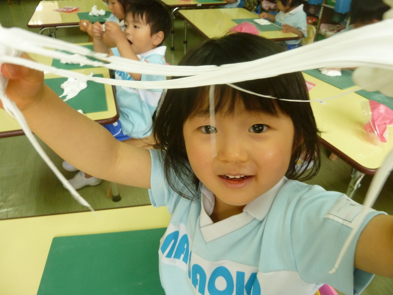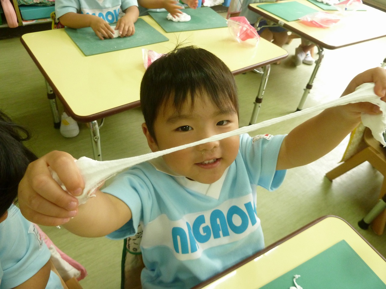 「キャーーーーー!!」不思議な粘土に大興奮の子供達。今日はビヨーンと伸びるとっても不思議な紙粘土を使って遊びました。「みて!こんなに伸びたよ!!」子供達同士のおはなしも大盛り上がり♪最後には好きな色の絵の具を混ぜて色をつけました。この紙粘土で今度はママへのプレゼントを作ります。でも・・・ママにはまだ内緒です♪
