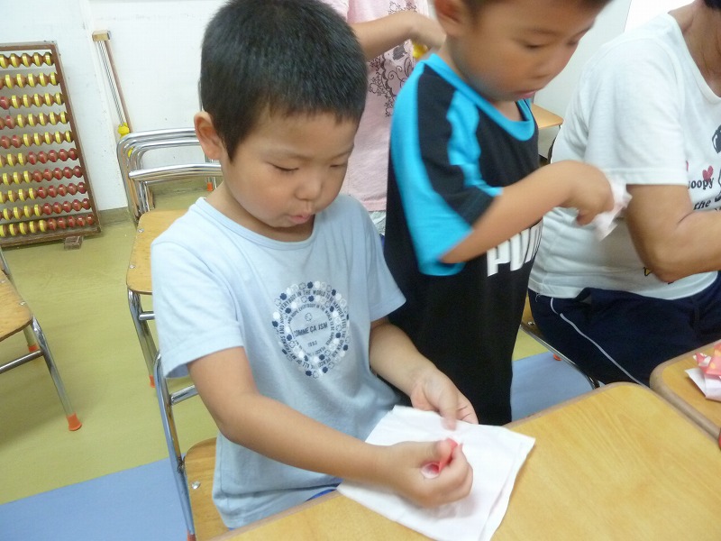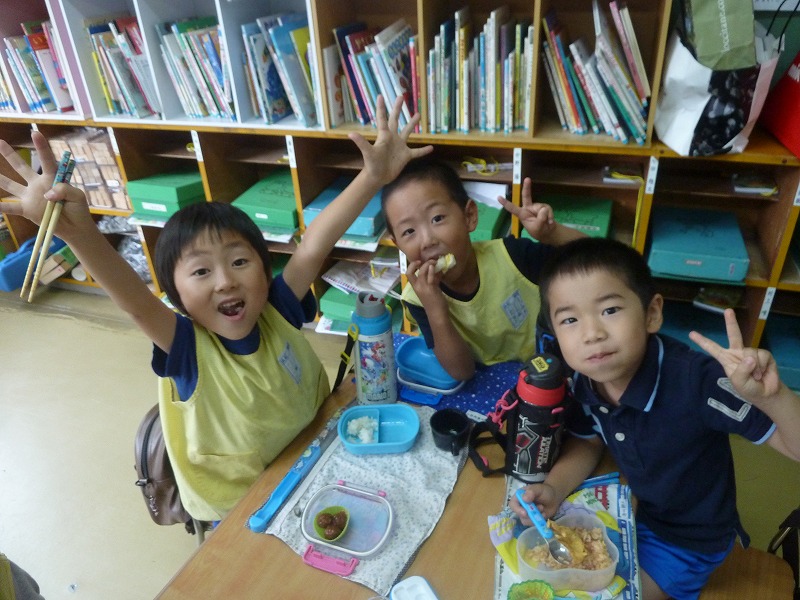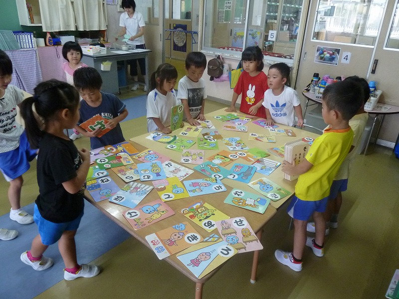 昨日に引き続き、今までのかんかん照りが嘘のように、雨がシトシト降っていますね。年中のホームクラスでは、かるた遊びが流行っています。文字も読めるようになり、頭で考えて競い合うのが楽しいようです。