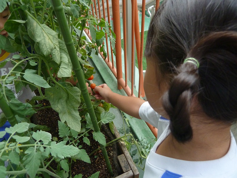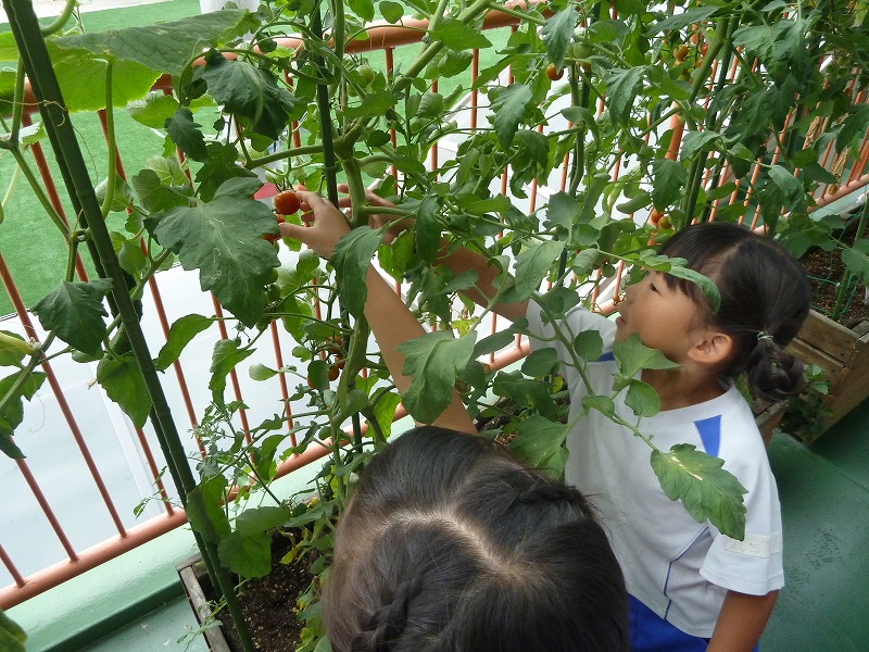年長さんの教室前に植えたトマトが赤く色づいてたくさんの実をつけていました。