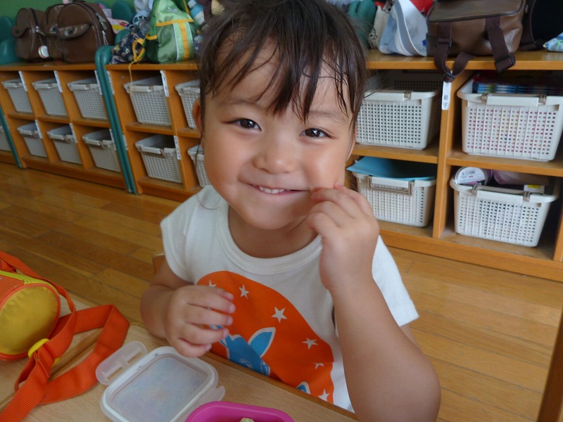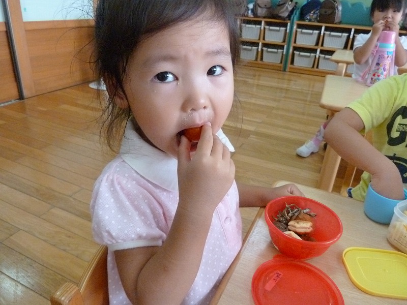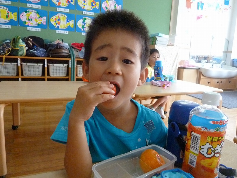 おやつの時間に、収穫し冷やしておいたトマトをみんなで1つずつ食べました。