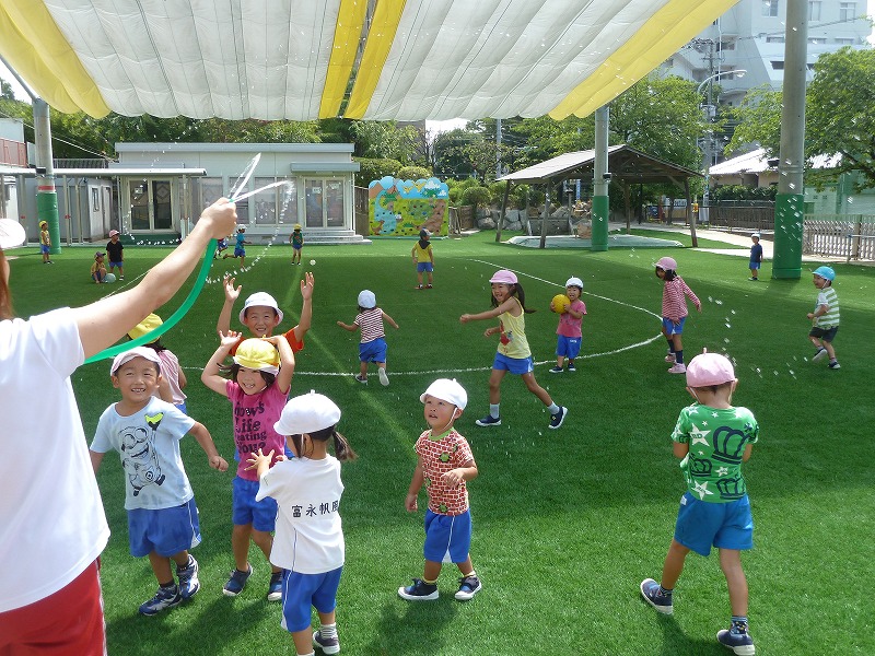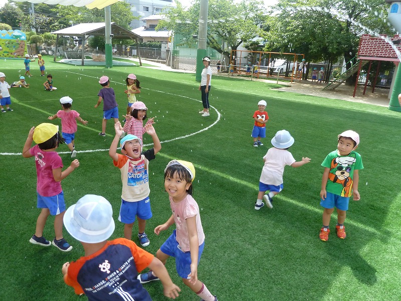 暑い日差しの中、子どもたちは気持ち良さそうに水遊び。