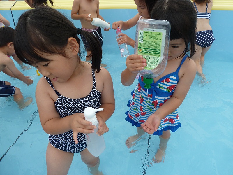 お友達と水をかけあったり、持ってきたもので遊んだり,