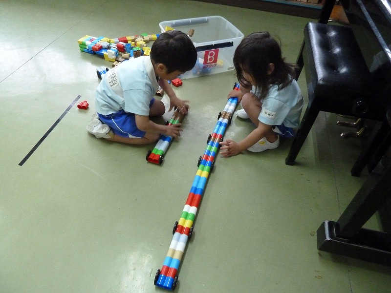 ブロックをながーくつなげたり、お絵かきをしたり、粘土でケーキを作ったり・・・