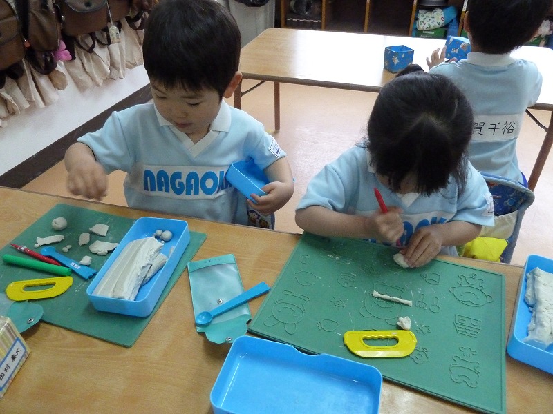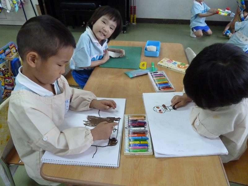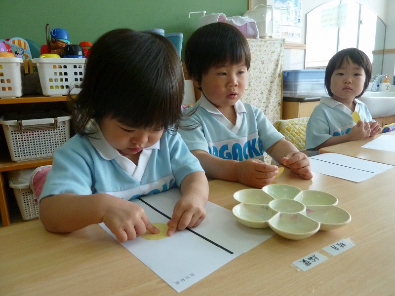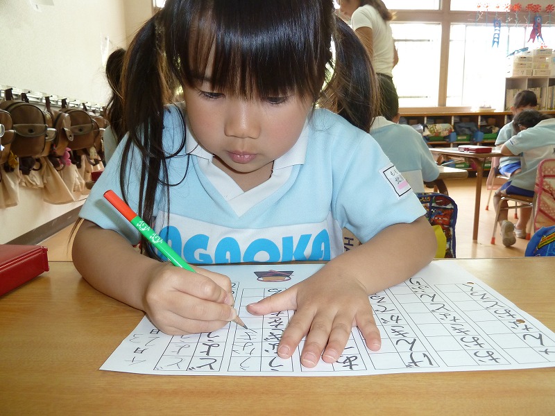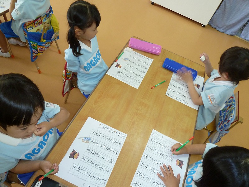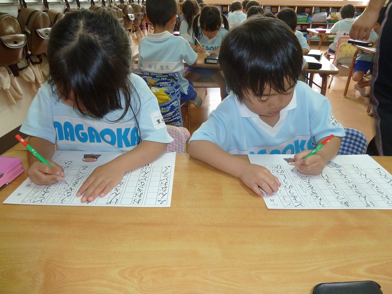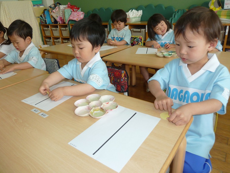 鉛筆の持ち方も随分上手になってきています。今日は、“まねっこ”です。お手本をよ~く見ながら、線の長さは?大きさは??どの子も真剣!!花丸をたくさんもらって大喜びの子どもたちでした。
