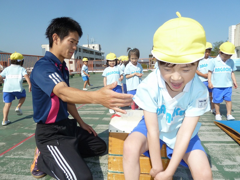 大好きな西畑先生と松元先生と体育レッスンです♪跳び箱も年少の頃から続けて随分上手になっています。「鉄棒も怖くないよ!」体をたくさん動かして遊びました。