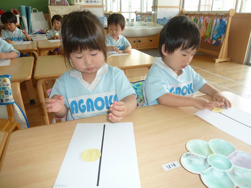 くるくる…ぺったん♪ 初めてののりあそび!今日はのりを使っておだんごを作りました!初めてののりの感触にちょっぴり不思議そうな子供達。でも、とっても面白かったようで子供達の顔は真剣そのもの!今度は何を作るか楽しみですね!
