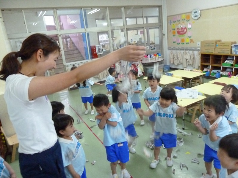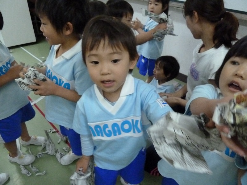 上からふらせたり、ボールを作ったり、とっても楽しい新聞紙遊び♪